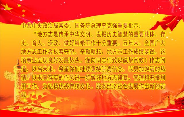 李克強對全國地方志系統先進模范座談會作出重要批示 2015年12月29日,全國地方志系統先進模范座談會在北京人民大會堂召開。中共中央政治局常委、國務院總理李克強作出重要批示。...